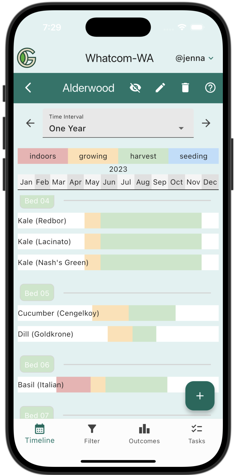 With GeoGardenClub, everything lives in one place! I have the visual representation of how long the crop will be in the bed (that I can easily edit on the fly), and if I want data on the crop, I can click on it.