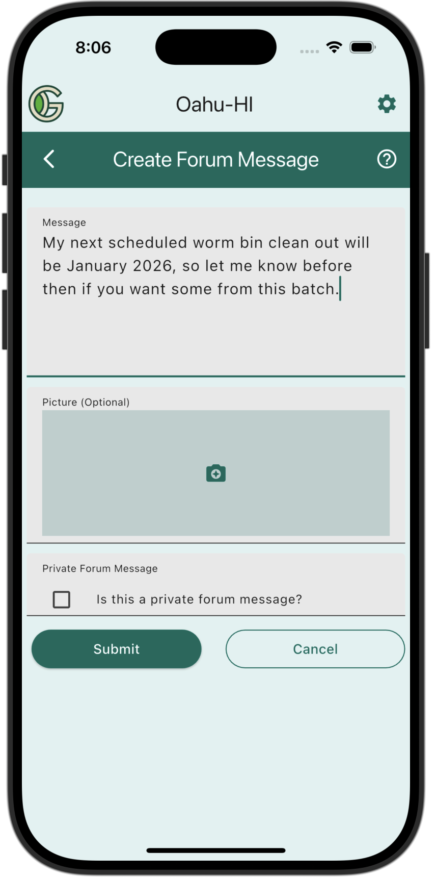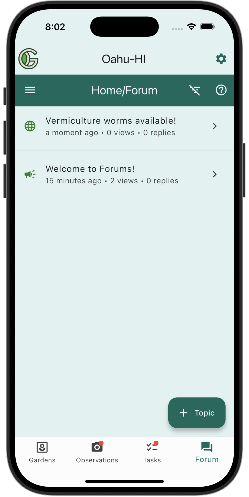 Forums are your way to communicate with other members of your chapter. You can use Forums to ask gardening questions, offer (or seek) excess produce or other gardening resources, or spread the word about local gardening events of interest.