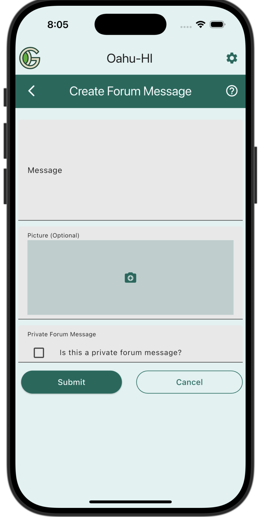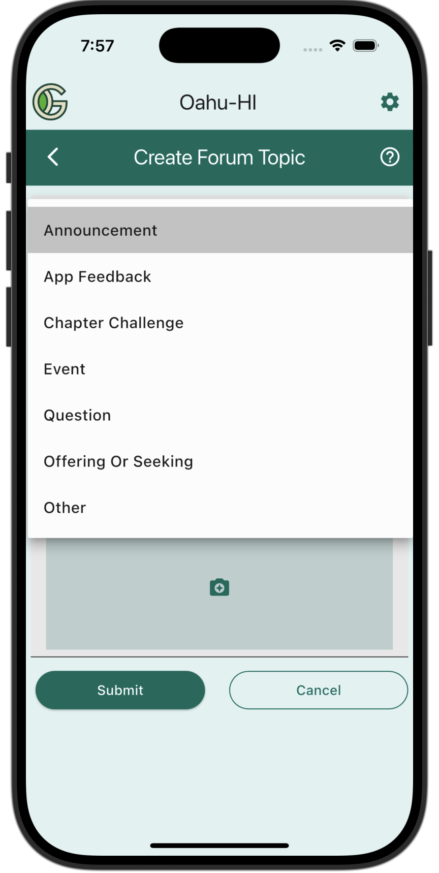 To create a new Forum topic, tap on the "+ Topic" button to bring up the Create Topic Screen: