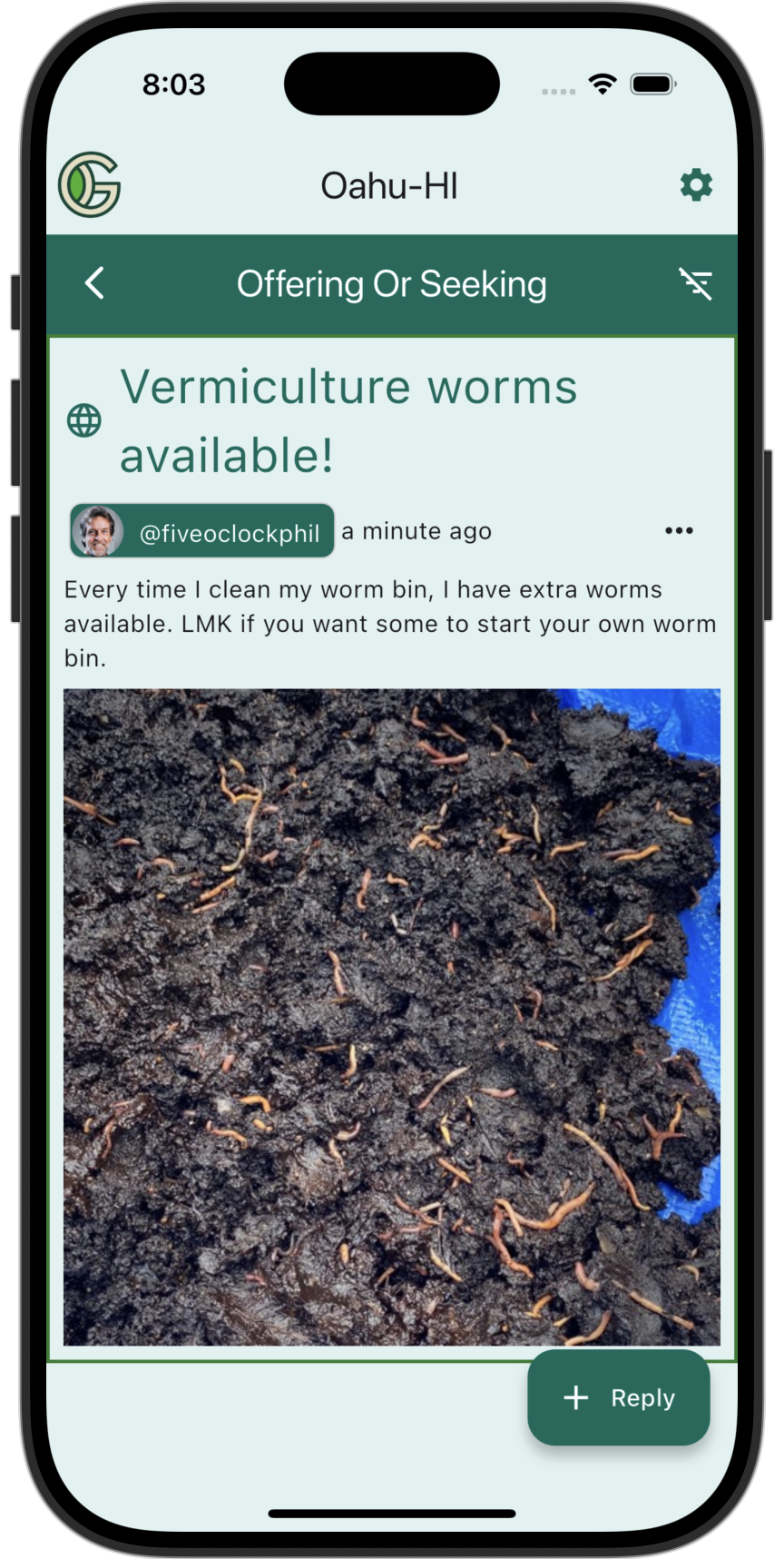 To reply to a posted topic, tap the "+ Reply" button at the bottom left of a posting (as illustrated in the above screen shot). This will take you to a screen where you can enter your reply: