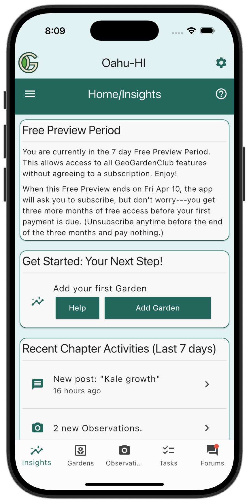 After you register and complete your User Profile, you enter a 7 day "Free Preview" period. This allows you to experience all of the features of GeoGardenClub without agreeing to a subscription.