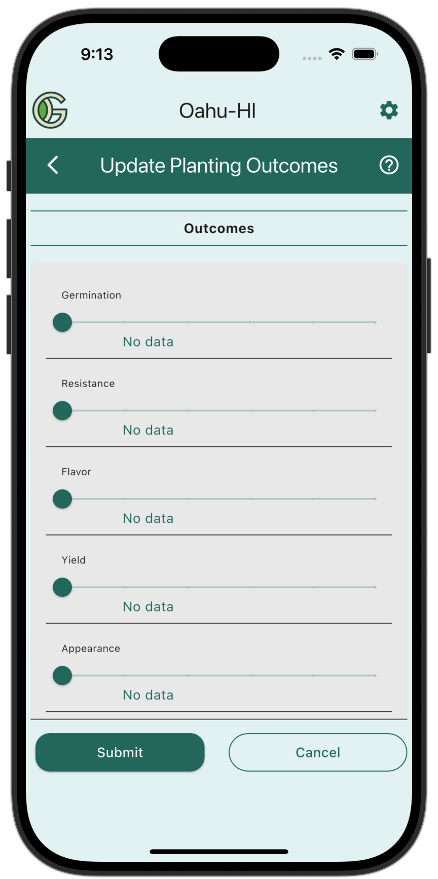 Specify the Crop, Variety, Bed, and Planting Date, at which point the Outcome sliders will appear. If there are previously recorded Outcome values, the sliders will be set to them:
